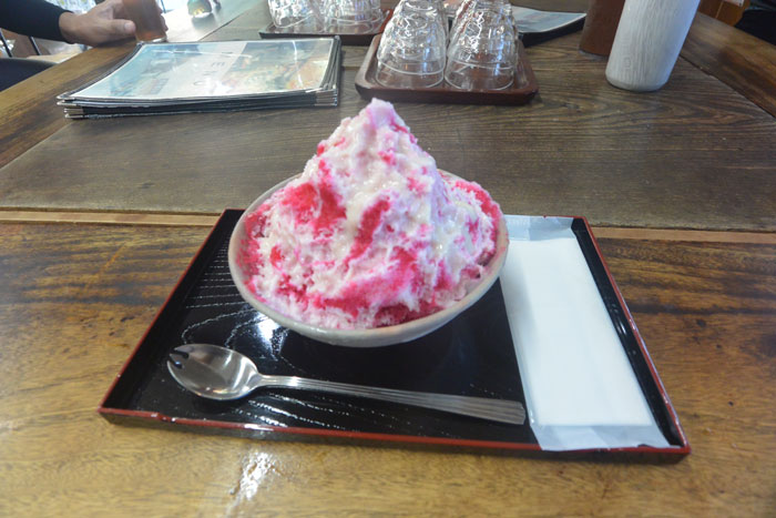 なんとかかき氷のお店にたどり着いて、出されたお茶をお替りしまくり、かき氷を頼みました。