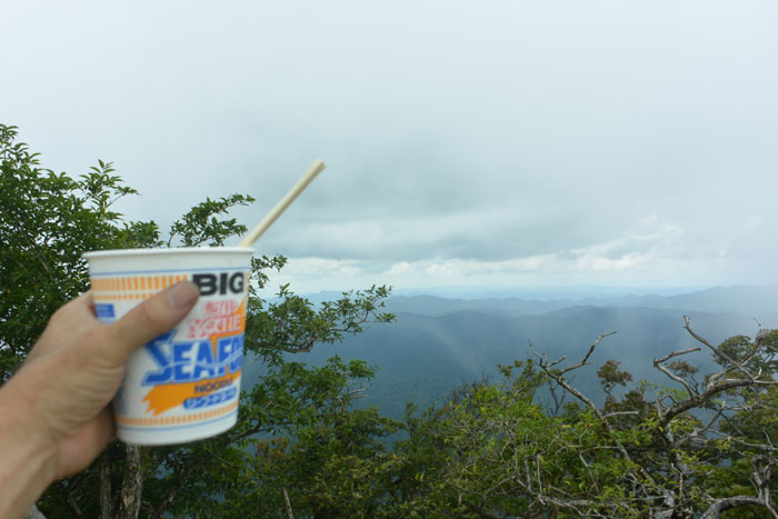 頂上は誰もいなくて、素晴らしい景色を独り占めしました。山頂でたべるカップ麺は最高です。カップ麺片手にいろんな景色の見えるところにウロウロしていると、下から何人か上がってきました。