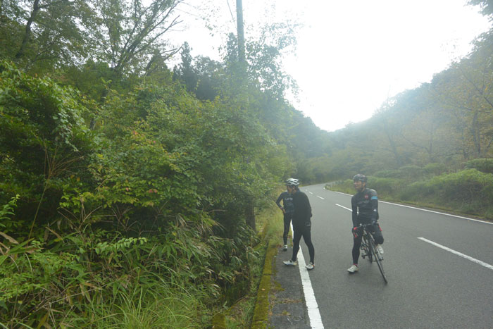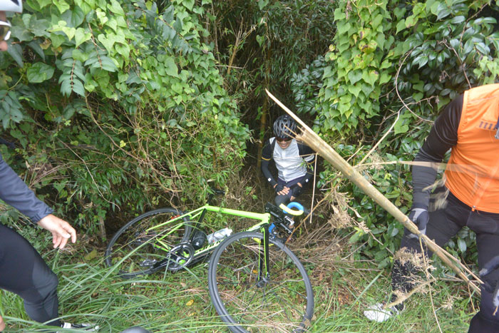 出発してほどなく、メンバーの一人がいきなり道から竹やぶに転落する事故が起きました。なんかリュックのずれを直していると落っこちたそうです。大事にならなくてよかった。