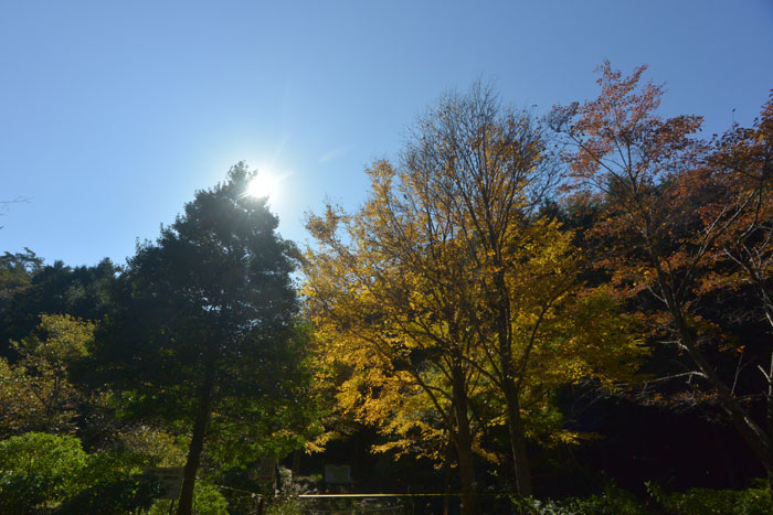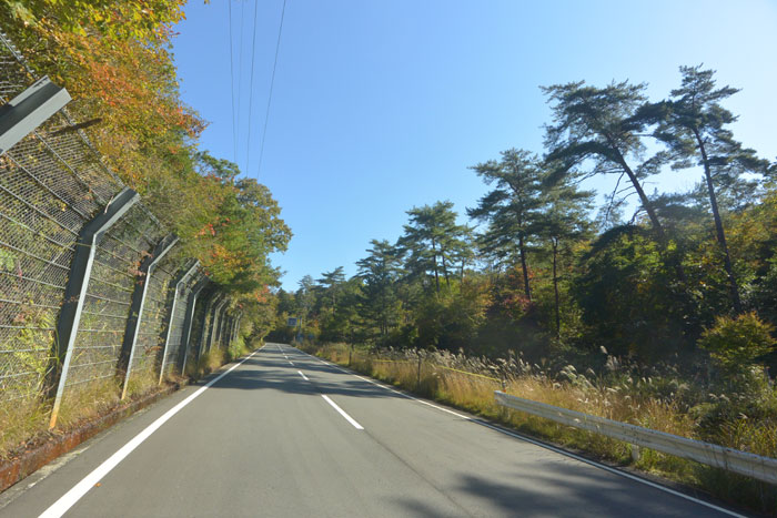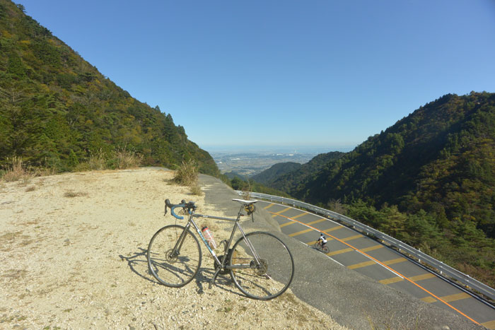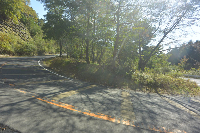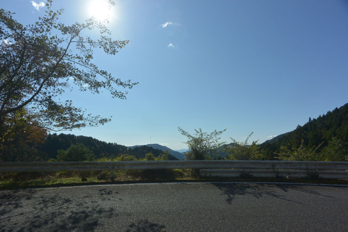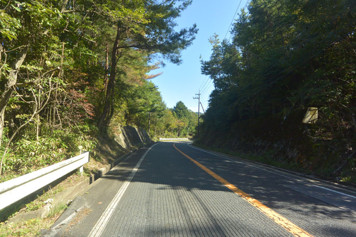 紅葉はまだ少し早かったけど、きれいな森の中を少しずつ高度を上げていきます。確か峠は標高800mくらい。距離を考えると大丈夫かな、と思っているとやっぱり峠近くなると勾配がきつくなりました。でも紀伊半島の坂に比べればマシ。