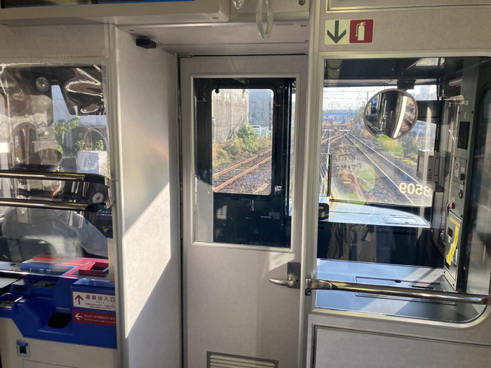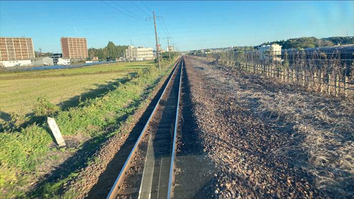 最後尾の広いところに自転車を置いて後ろと景色を眺めていました。線路見るの楽しい。