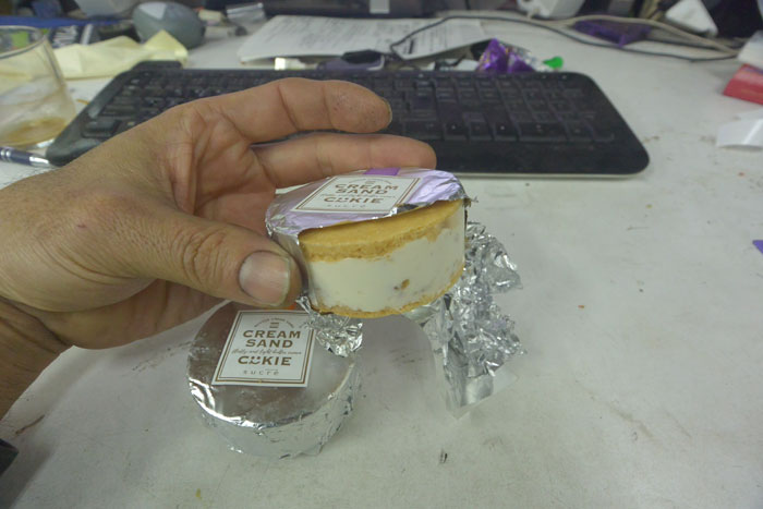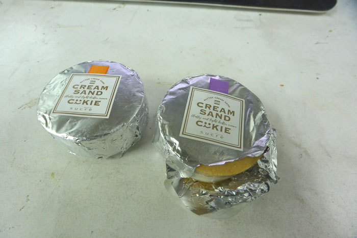 はじめクリームサンドというからビスケットの間にクリームが挟まっているオレオみたいなのかな、と思っていたのですが、ぎんがみをむいたらなんと一個でした。
