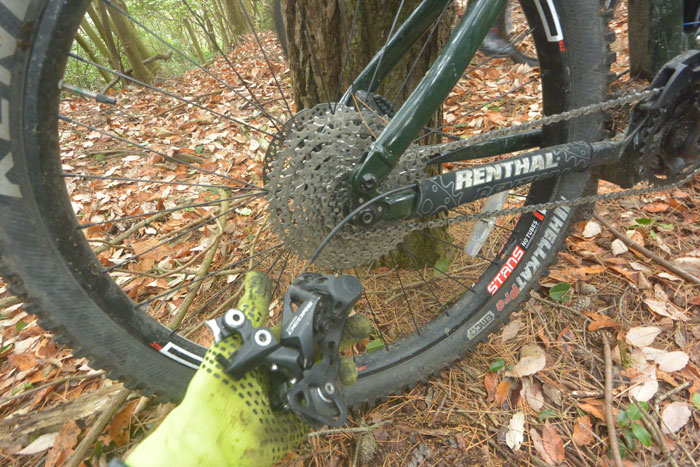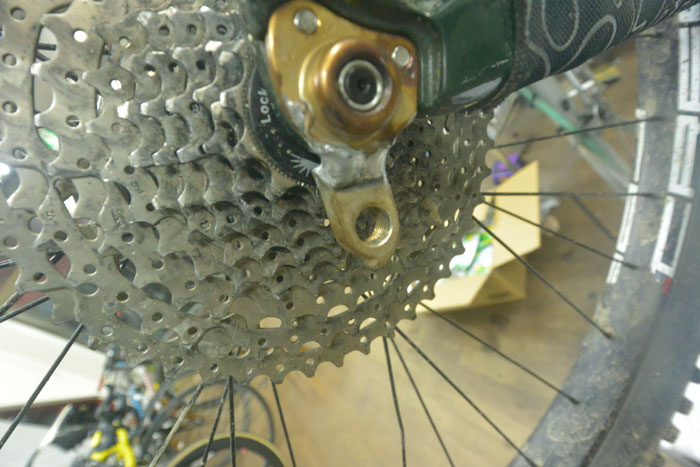 シングルトラックを走っていた時に枝を巻き込んでしまい、リアメカごとグニっと曲がってしまいました。