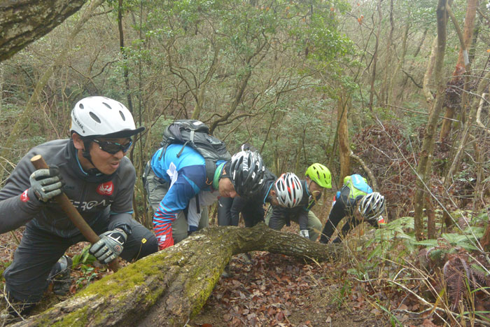 このコースの最後に大きな倒木があったのですが、前回時間的、体力的によけるのができなかったので今回みんなで頑張ってみることにしました。