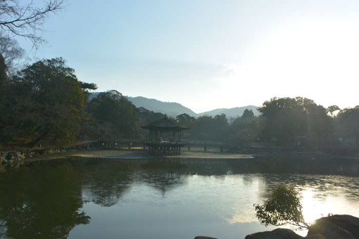 何も考えずにお店を飛び出して気温の低さにちょっと面くらいました。浮御堂の池の水は凍っていました。