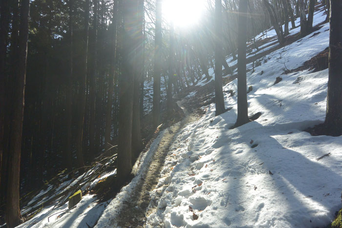 僕らも人の列に乗って山を登り始めたのですが、中間地点ほどから登山道に雪が出てきました。