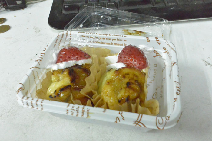 スイートポテトってもっとこう、お芋をつぶして固めました、っていう感じの形をしていますが、これはそれにイチゴと生クリームがのっかっていました。