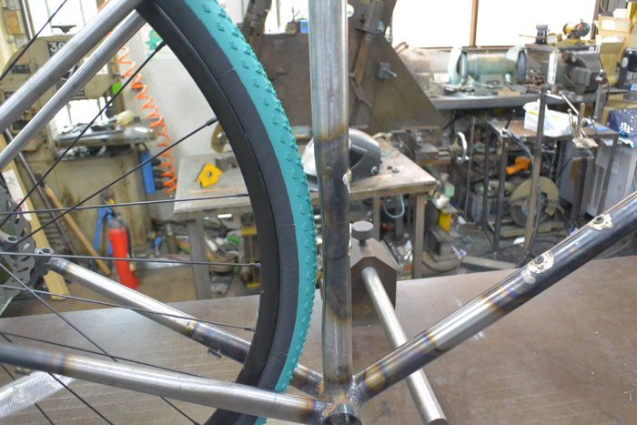 それからそれから、リアセンターを思いっきり短く設計しているらしく、太いタイヤを入れるとシートチューブに干渉します。だからシートチューブをつぶさなければいけません。