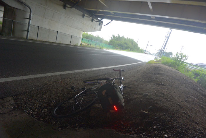 マグロまで頑張ろうと平野を走っているといきなり土砂降りの雨に襲われました。バケツをひっくり返したような雨。高速の下で雨宿りをしました。