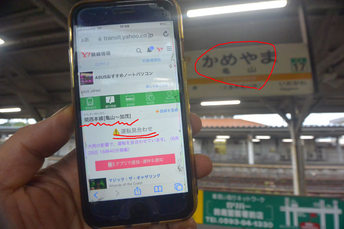 とりあえず亀山駅で駅員さんに聞いてみます「どんなくらいで復旧しますかねえ?」「現在線路確認中で復旧のめどは立っておりません」「なんか崩れたとか災害の情報はありますか?」「ありません。」