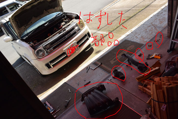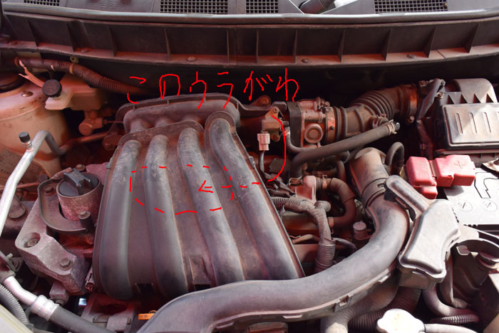 エアインテークを外してスロットルボディ、エアフロセンサー、サージタンク、インテークマニホールド、EGRのホースなどを外し、ようやく目的の部品にたどり着きました。