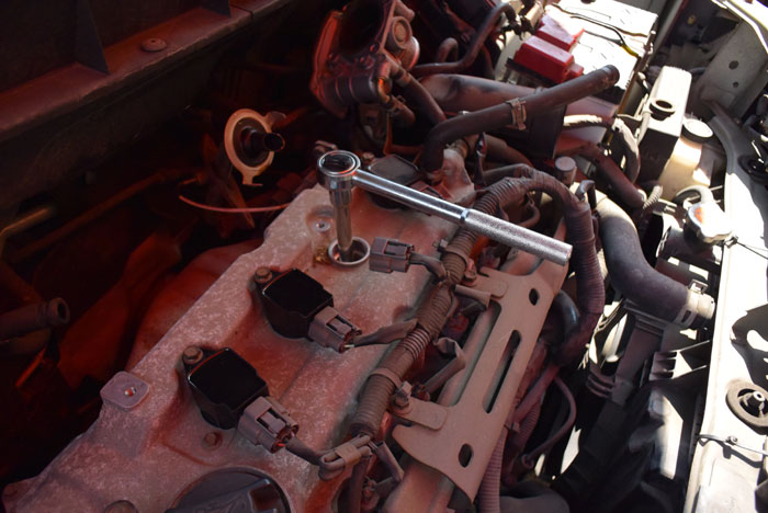 プラグとイグニッションコイルに行きつくまでにエンジンのいろんなものをばらさないといけない構造でした。見る限りではわざわざこれをここに配置する必要ななさそうなものばかりです。