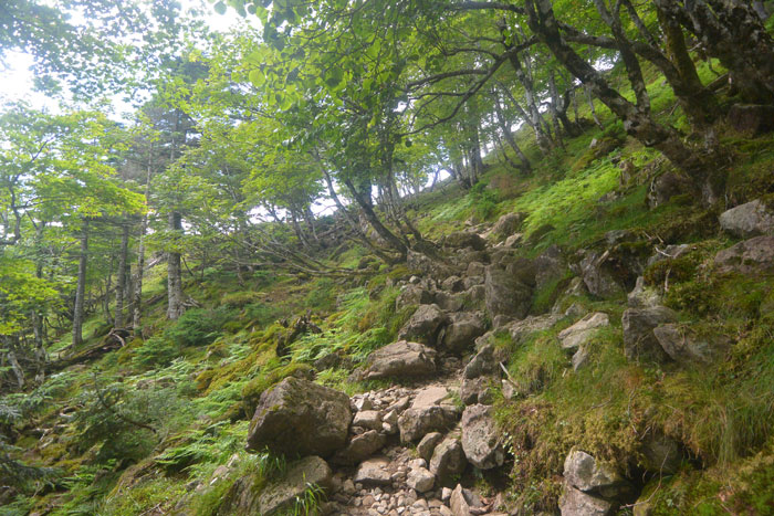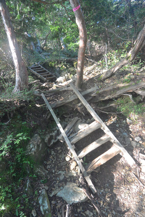 スタートしてすぐ川を渡ると稜線に向かって直登。これは記憶にあったから覚悟していたけど、25年前に比べて道が荒れていて大変。ねっこの張り出しや段差が大きくて大変。