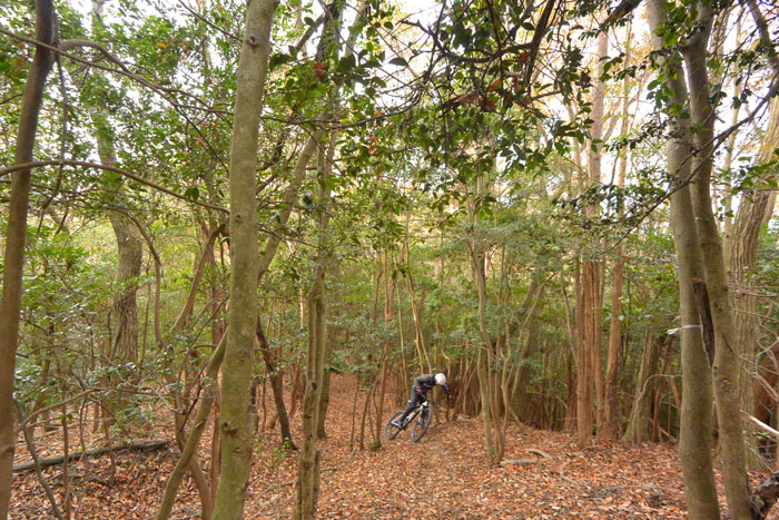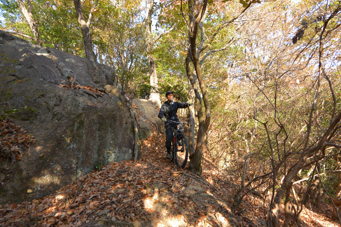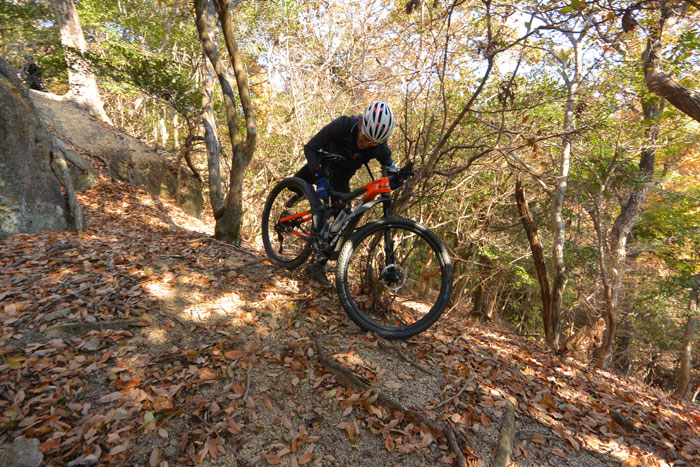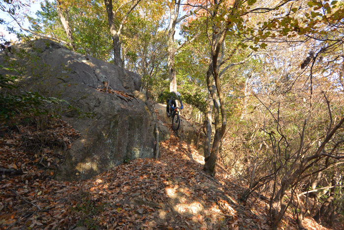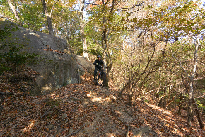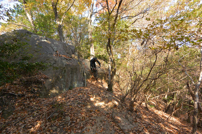 後半で岩を下りる、というか落ちるようなセクションがあるのですが、ここがなかなかスリリングです。技術的には難しくないのですが度胸が必要です。ビビッてブレーキを握ると前転します。ちょっと怖いんですね。