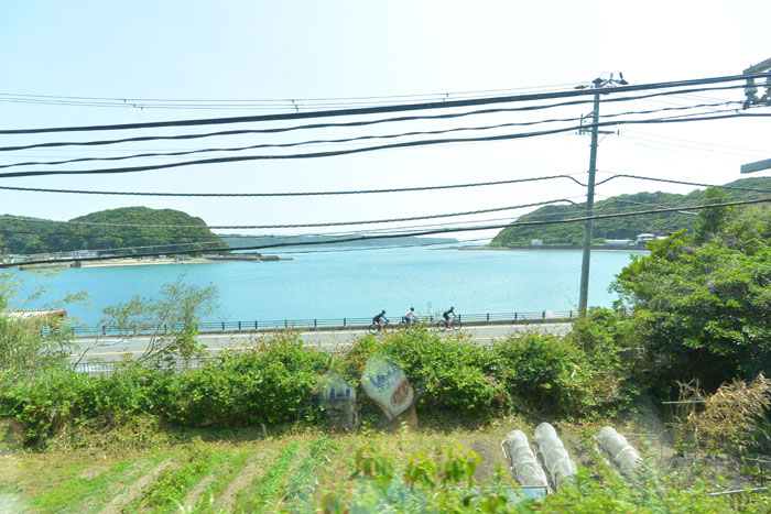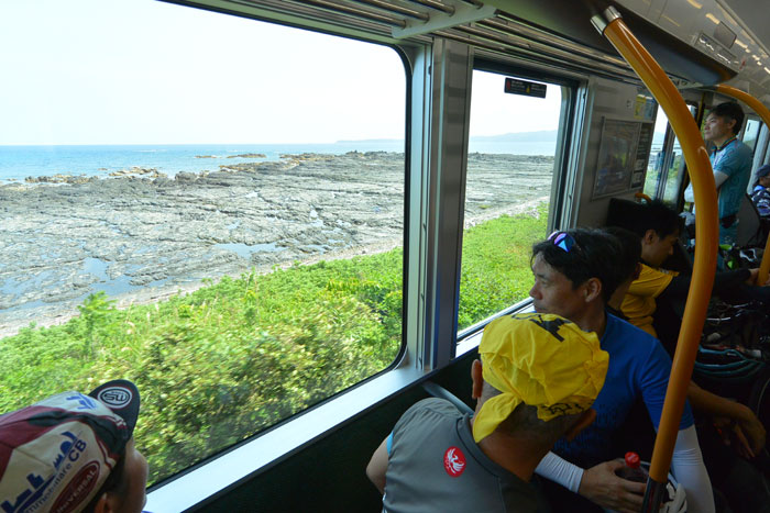 車窓からはきれいな海が見え、そして全工程を走っているサイクリストの姿も見え、手を振りあったりととてもいい雰囲気でした。