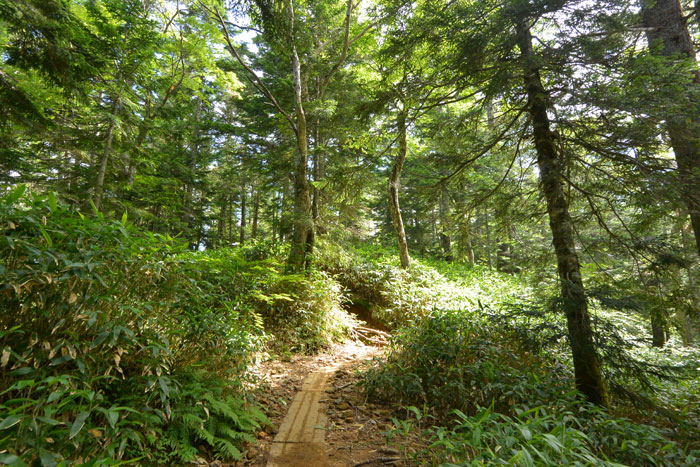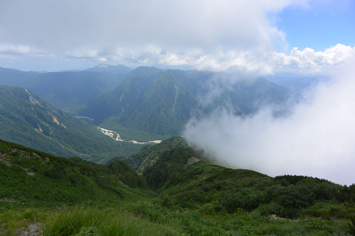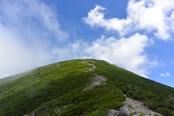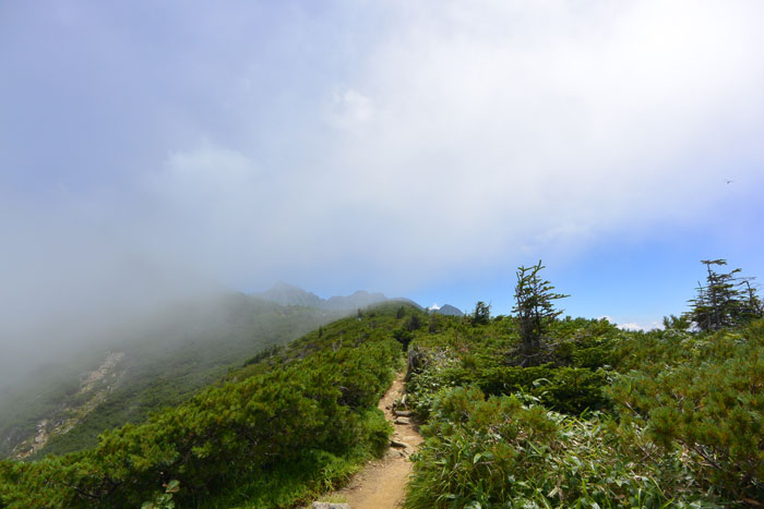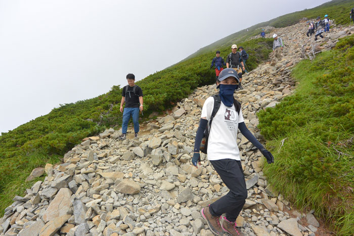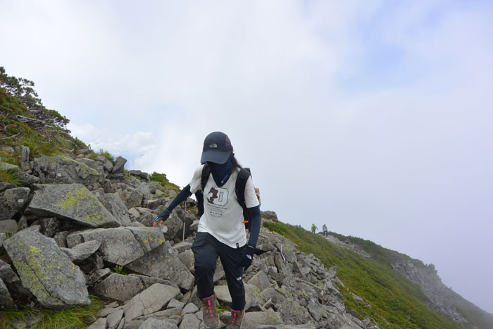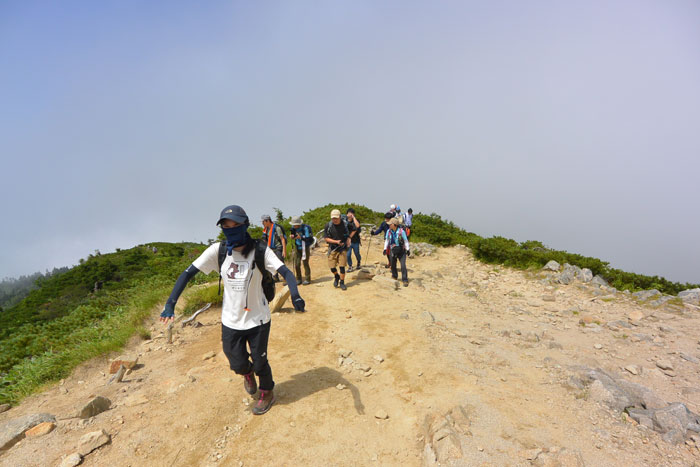 左側、北側は少しガスが登ってきて晴れたりガスに入ったりという感じでした。ガスは視界が悪いけど涼しくて歩きやすいです。