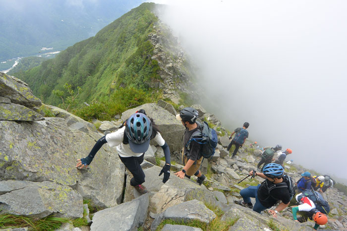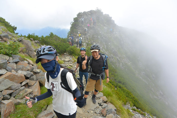 ここからはちょっとした崖登りです。人も多く浮石も多いので自転車用ですがヘルメットを着用。みんないっぱしのやまのぼらーに見えます。