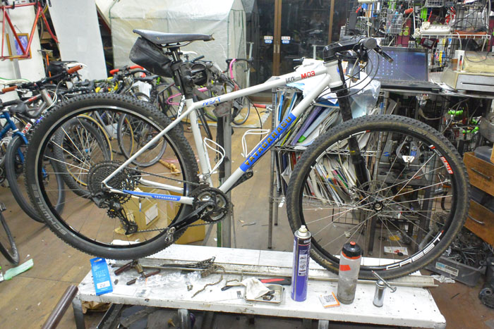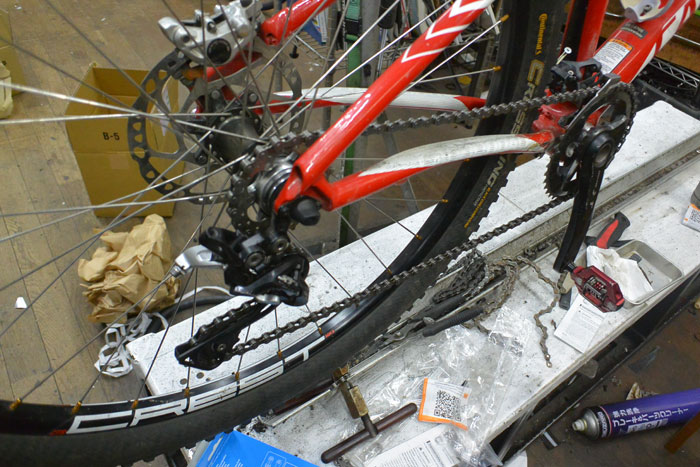 自分のバイクをこの日のためにフレームから作ってんで!そしてお客さんのバイクを部品を加工してシングルスピードにしてんで!それから別のお客さんのフロントロックアウトのレバーの折れたのをバンドを自作して修理してんで!それから調整したり消耗品交換したり・・・
