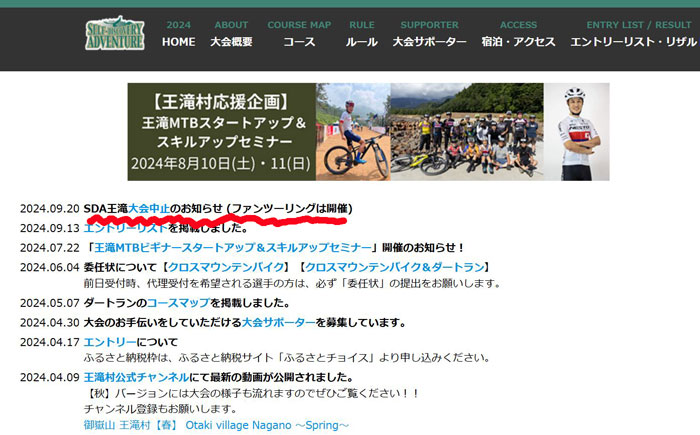 今週末のセルフディスカバリー王滝が中止になりました・・・