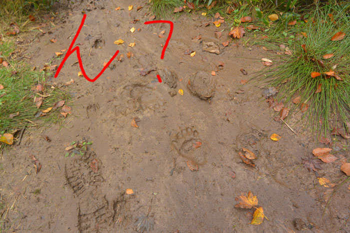 途中小さな沼の横を通ったのですが、すこし道がぬかるんでいるところを差し掛かったところ、泥になんか見たことのある足跡がありました。