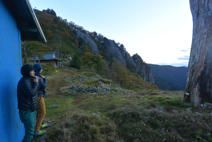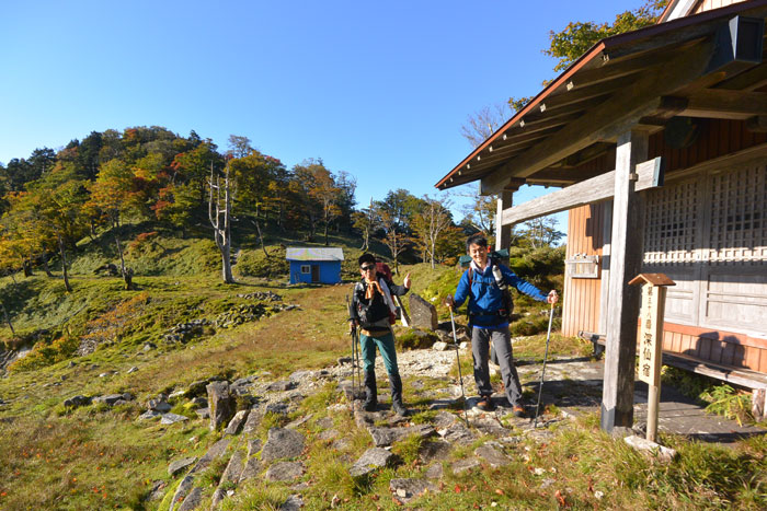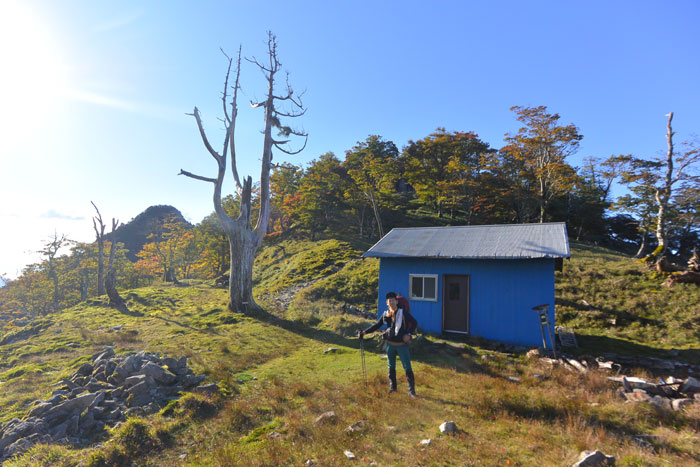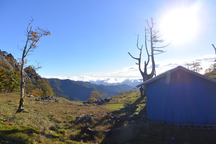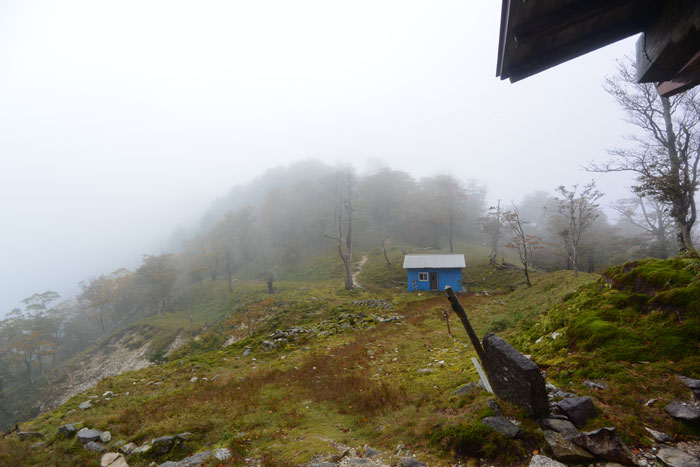 1時間ほど進むとお堂と青い小屋のあるテント場につきました。