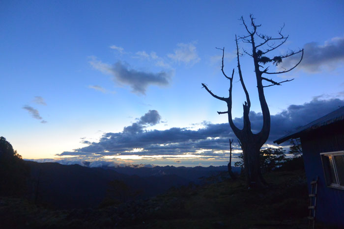 天気が怪しいのでテントサイトは避難小屋のある場所の傍らにする計画にしました。万が一の時は避難小屋逃げ込めるように。