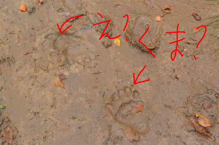 こ、これは・・・北海道でよく見た足跡です。北海道のそれよりかは小さいものの明らかにクマの足跡です。しかもたった今出来立ての足跡でした。