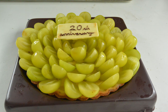 おとといに家族に20周年の話をしたら記念にシャインマスカットのタルトを作ってくれました。