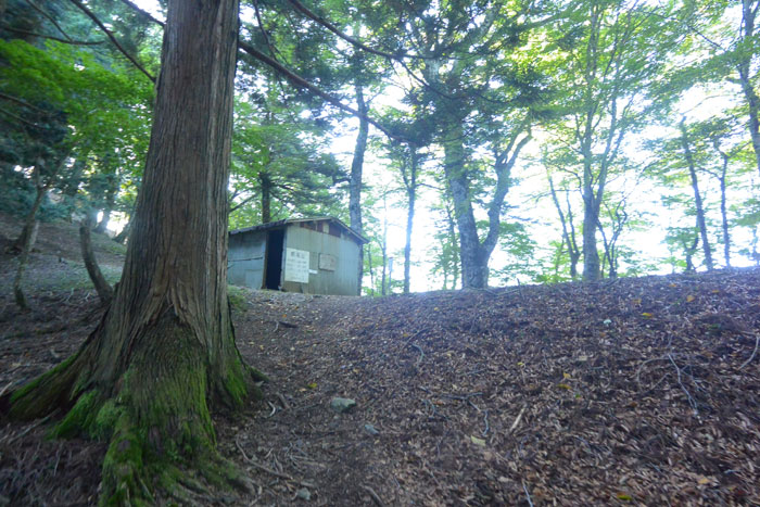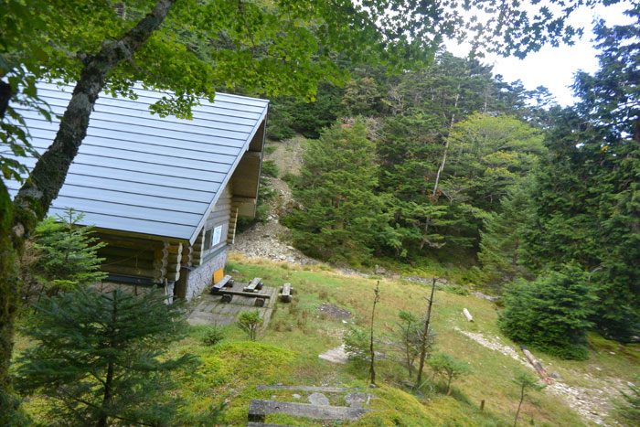 長い長い木の階段を降りると狼平避難小屋に到着。