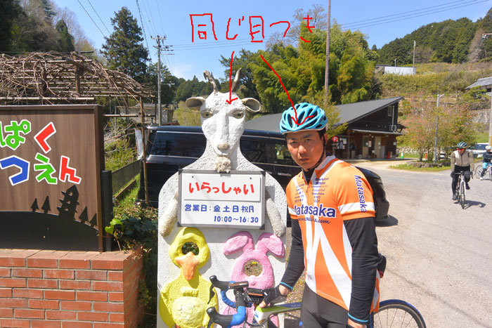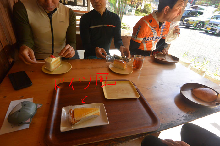 この後ダム湖畔を上流に向かって走り、わんぱく動物園でケーキを頂きました。ドイツ風チーズケーキ。ドイツ風でした。