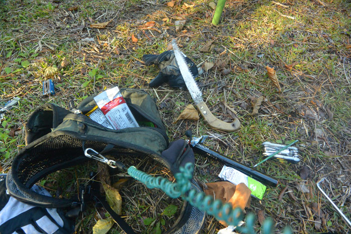 前回は折り畳み式ののこぎりを倒木や枝を掃うために持って行ったのですが、倒れた枯れ木を切っているときに折れてしまいました。まあ、古かったから寿命だろうなあ、という感じだったのですが。