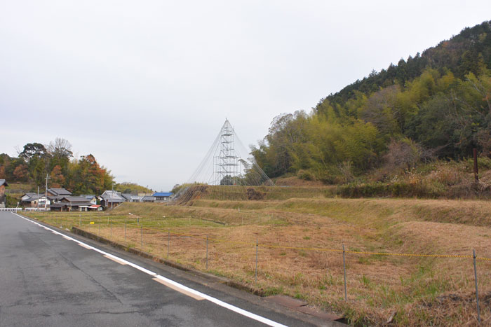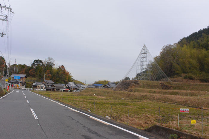 で、そのコースの途中、不思議なものを見つけました。田んぼの中に三角錐。かなり大きい。