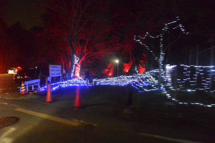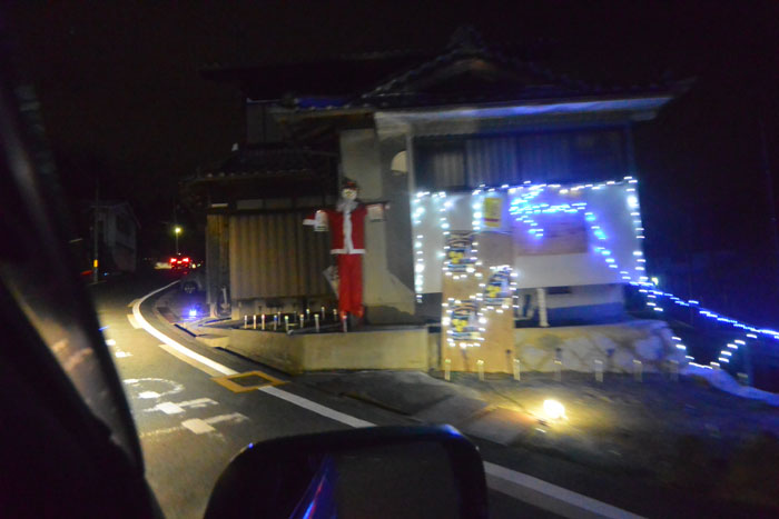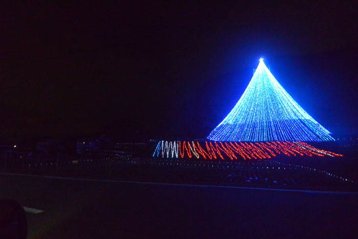 結構すごいじゃないですか。こういっちゃ失礼ですが、こんな田舎にいきなりでかいツリーがあるとなかなか圧巻です。周りが真っ暗だからより際立ちます。