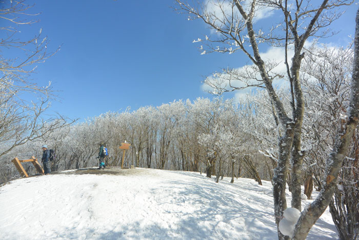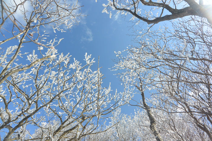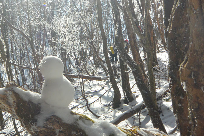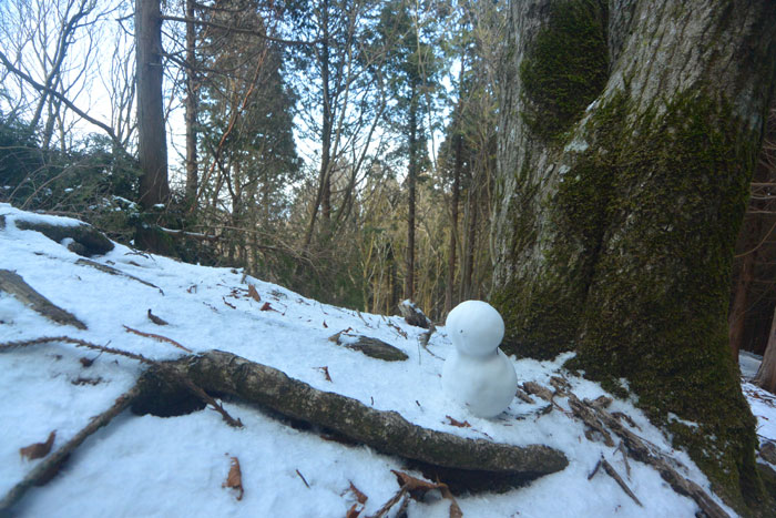 道の途中に小さい雪ダルマが作ってあって、なかなかかわいいものでした。ほんとにやたらとあるので、そういう雪ダルマ作り器でもあるのかと思ったけど、どうだろう。雪だるまの後頭部に寝ぐせみたいに霧氷がついてたのはちょっと笑った。