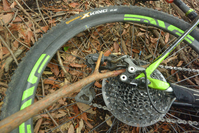 そんな初心者を難しいところへ連れてって転ぶのを見て大喜びした天罰か、気をよくして雨も降らなさそうなので、さらにシングルトラックへ行ったのですが、喜んでシングルを走ってたら枝を巻き込んでエンドをぶち折ってしまいました。