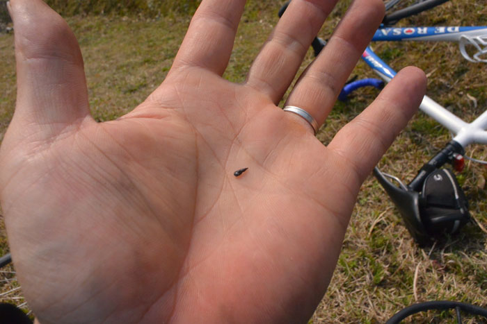 で、パンクの原因は釘の先っぽのような鉄のとげが刺さってました。