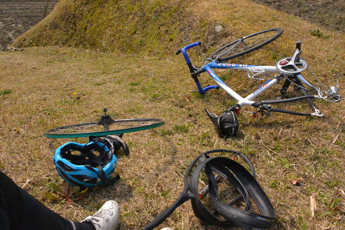 ああ・・・と道の横のあぜ道に自転車を置いてセコセコ修理しました。