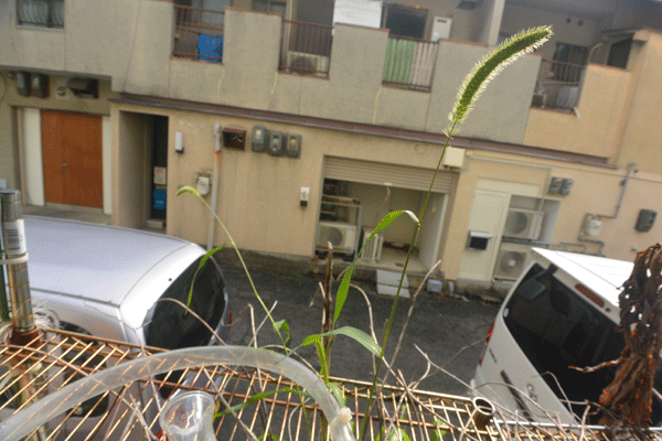 で、久々に開けたら窓の下に置きっぱなしになっている植木鉢から生えた猫じゃらしがいました。
