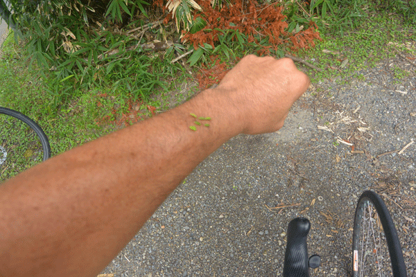 気が付いたら腕の毛にひっつき虫がついていました。服ならまだしも、じかにつくと、なんか自分が獣になった気持ちです。