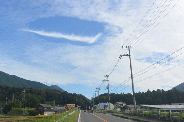 先日、朝走りの時にへんな雲があったという日記を書いたのですが、さすが、その答えをお客さんが教えてくれました。 なんと穴あき雲、ホールパンチ雲というものだそうです。 ウィキペディアからの受け売りですが、上空に氷点下でも凍っていない水蒸気があって、それが何らかの拍子に凍り始めると、周りの雲である水滴を吸収して、周辺の雲がなくなってしまうことなのだそうです。まず、氷点下でも凍っていない水滴が僕らが頭の上を漂っている、という事実にも驚きですが、こんな現象が起こっているのも、感動ですね。 なかなか珍しい現象らしいです。みなさんも時々空を見上げてみてね。 いいものが見れるかもよ。