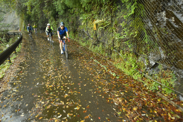 僕らはマイペースで走ることにしました。前日の雨で路面はウェットで、落ち葉や落石がいっぱい。かなり慎重に走ります。