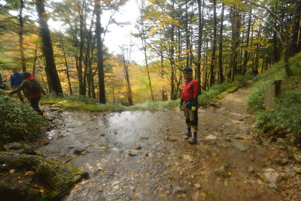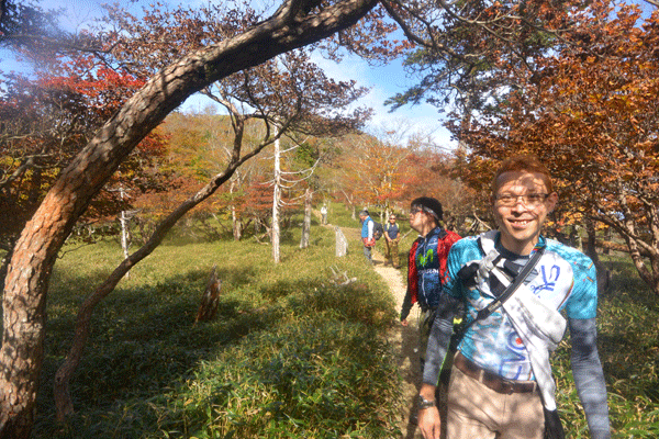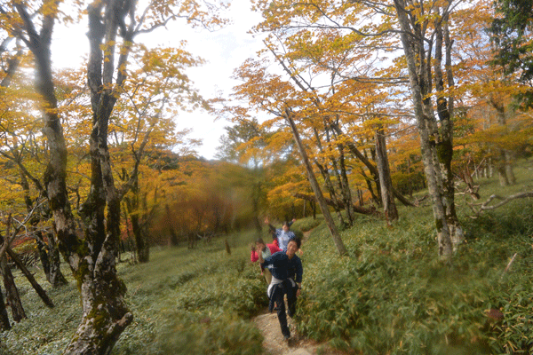 みんなでのんびり歩きます。なかなか美しい紅葉です。ブナ系が多いから黄色が多いなあ。
