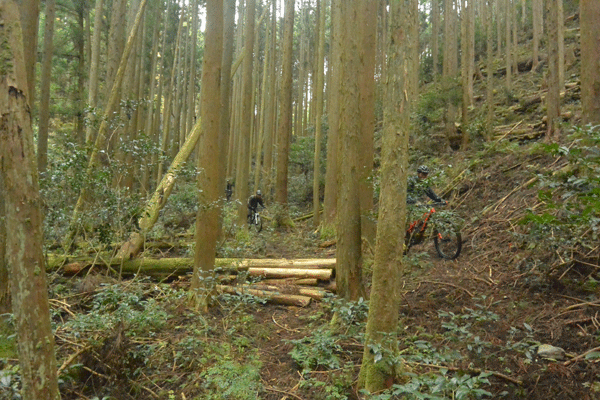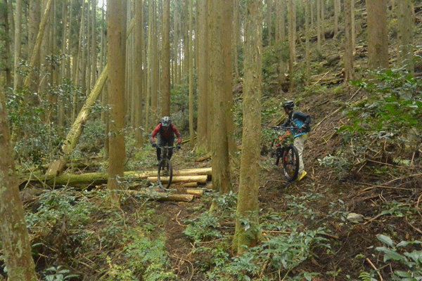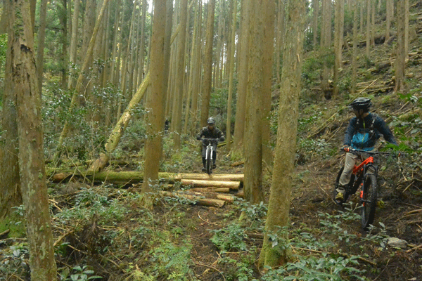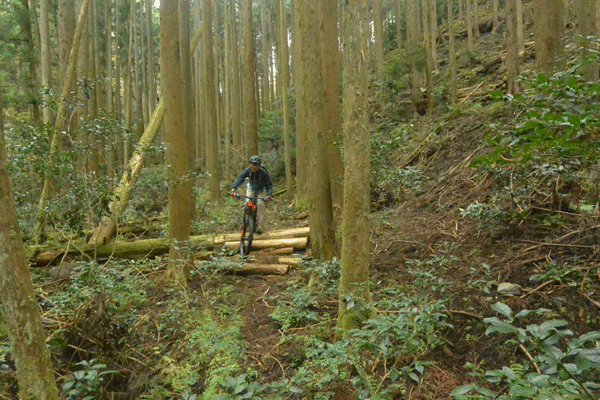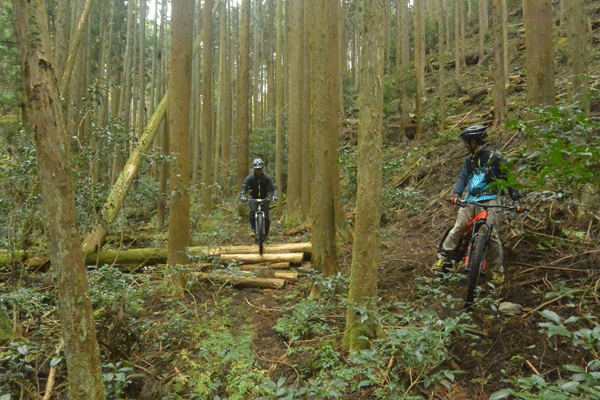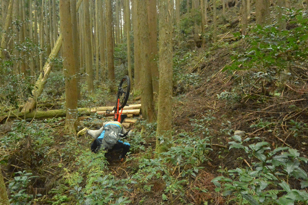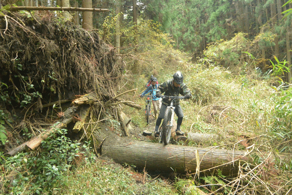 で、ワイワイといつも通り楽しく走っていたですが、シングルトラックの後半で、大きな倒木を乗り越えるのに、手前と後に丸太を組んでジャンプ台状態にしているところがあるのですが、まあ左側に迂回できるようになっているのですが、結構怖い度胸試し的なポイントがあります。