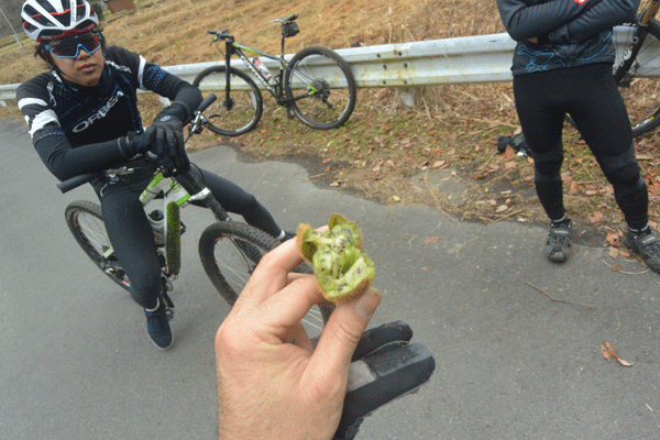 いつもどおりメンバーとしゃべりながら登っていると、なんか路面に見たことのある実が落ちていました。