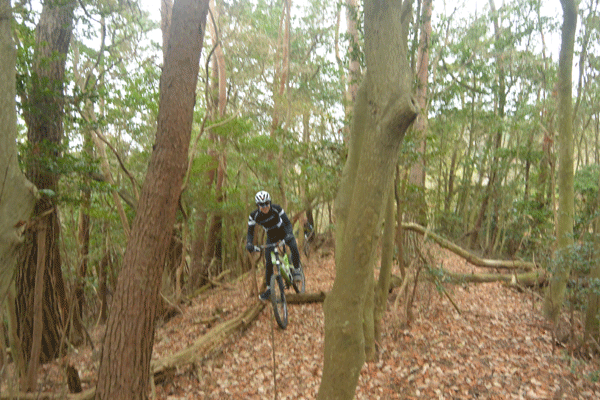 で、シングルトラックに入ると、普段から鍛えているからか、バランス感覚もよく、しっかりついてきます。初めてなのに驚くほど走れます。ふつうについてきます。